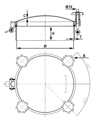 Manlucka rund för tryckkärl Ø600 H=100x6 316L FEP/silikon Ra<08